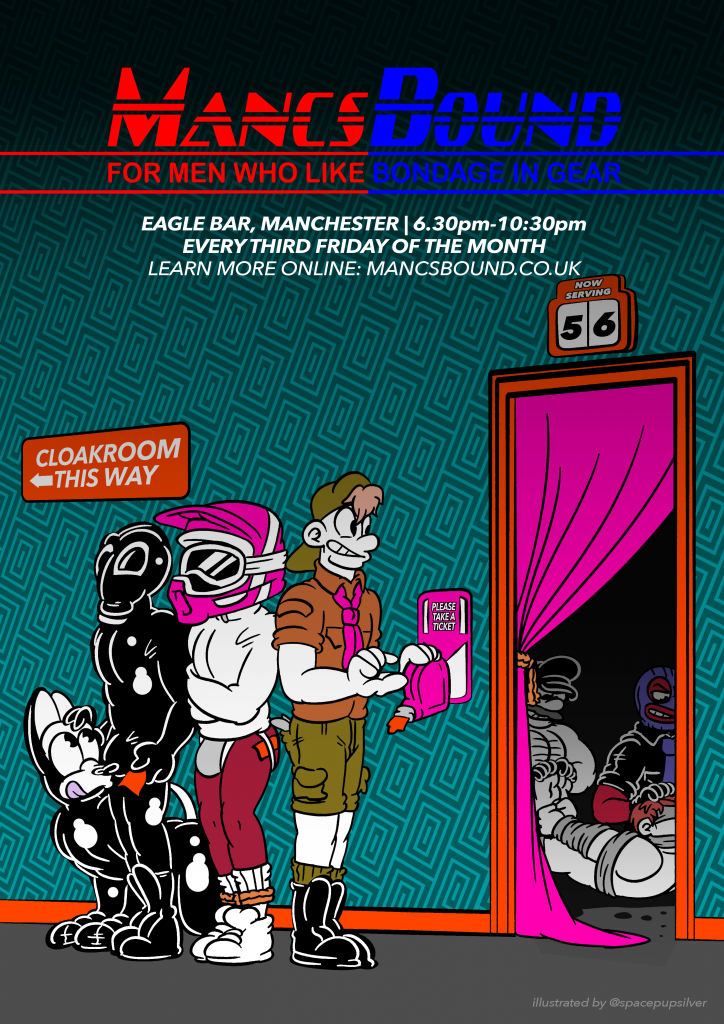 MancsBound is a bondage event for men and anyone presenting as male, run by volunteers with a fetish dress code. Held on the 3rd Friday of each month at the Eagle Bar, Bloom Street in Manchester from 6.30pm to 10.30pm. Last entry is 9pm.