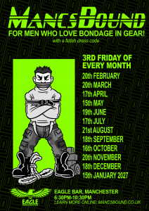 Save 20% off admission when you buy a combined ticket for Mancsbound (3rd Friday) and Club Locked (3rd Saturday) when they fall on the same weekend by following the link on the poster below the event dates. Combined tickets don’t include membership for either event, you can buy Mancsbound membership cheaper in advance by clicking here.